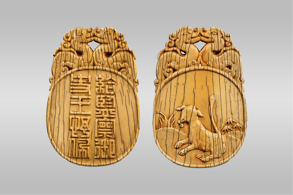 此腰牌呈椭圆形,光泽明亮,牌正面竖刻篆书“给监察御史王忬佩”。王忬为明代监察御史,属 明政府都察院职官,明史有传,嘉靖三十一年(公元 1552 年)任兵部右侍郎、右都御史。