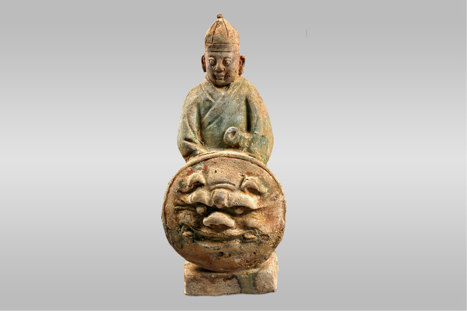 此俑头戴六合统一帽,身穿高领衣,手持虎头 盾牌,形象生动。