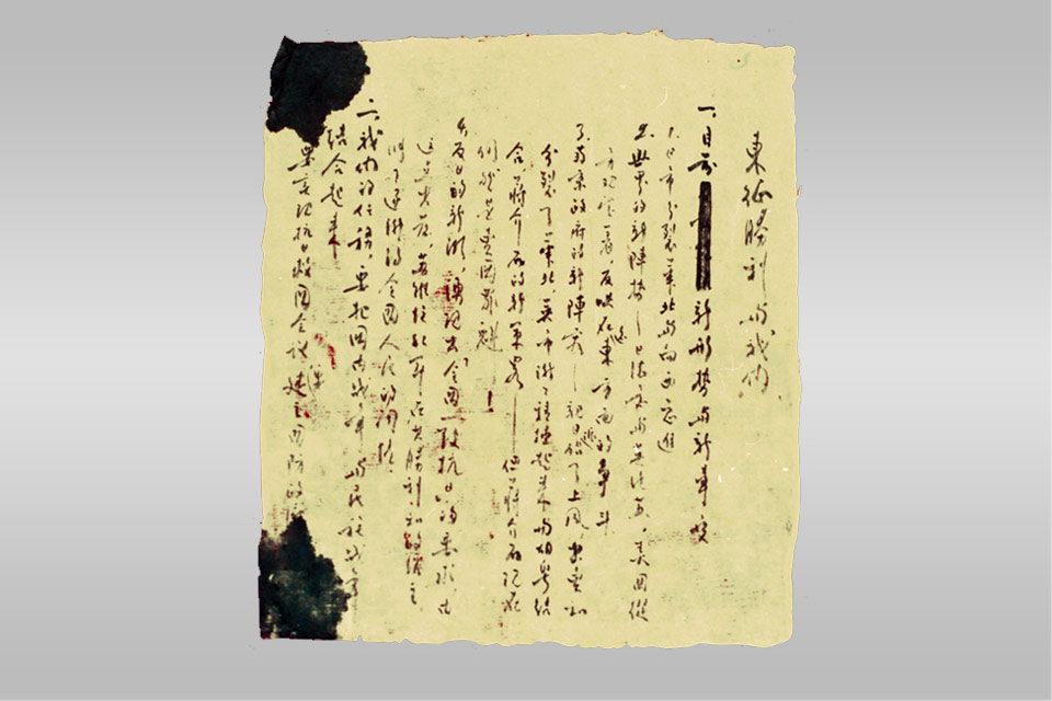 此为周恩来记录手稿,手稿左上角、左下角有蓝色墨迹。主要内容有:一、目前新形势与新事变。 二、我们的任务,要把国内战争和民族战争结合起来。三、我们后方同志的责任。