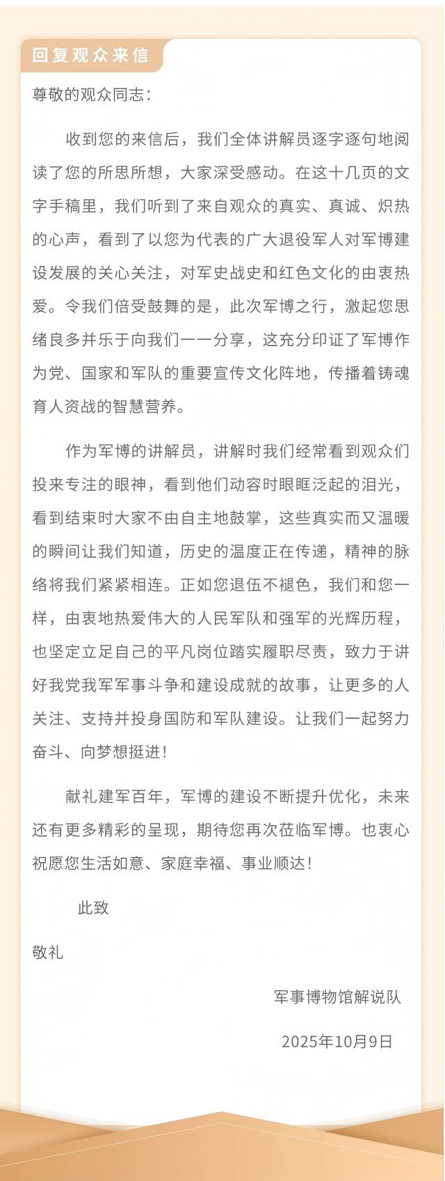 这封观众来信让我们倍感振奋。作为保存、研究、展示党领导人民军队奋斗历程和伟大业绩的重要阵地,军博将向着建设与人民军队百年历史相称,与全面建设世界一流军队相适应的红色大馆不断迈进,以更具思想性、感染力的陈列和更加温暖、专业的服务回馈每一位观众。